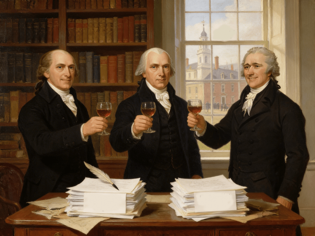 During the fall of 1787 and the spring of 1788, three remarkable men—John Jay, Alexander Hamilton, and James Madison—worked tirelessly to write a series of essays known as the Federalist Papers. These essays were crafted to convince the citizens of the newly independent states to ratify the Constitution, establishing a constitutional republic that balanced power and safeguarded liberties. Their efforts were instrumental in shaping the framework of the government we know today.